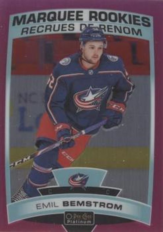 The Emil Bemstrom 2019 O-Pee-Chee Platinum #166 Matte Pink Rookie card is 1 of 22 Emil Bemstrom's card variations in the 2019 O-Pee-Chee Platinum set being tracked by Sports Card Investor, including Base, Rainbow, Sunset, Violet Pixels /399, and Red Prism /199.