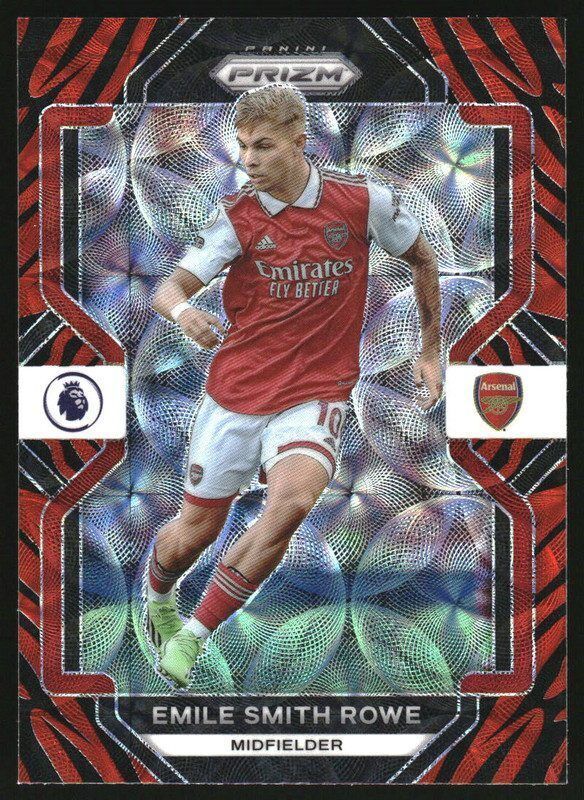The Emile Smith Rowe 2022 Prizm Premier League #159 Choice Tiger Stripe /(SSP) card is 1 of 52 Emile Smith Rowe's card variations in the 2022 Prizm Premier League set being tracked by Sports Card Investor, including Base, Breakaway, Choice Blue Yellow Green, Green Ice, and Green Pulsar.