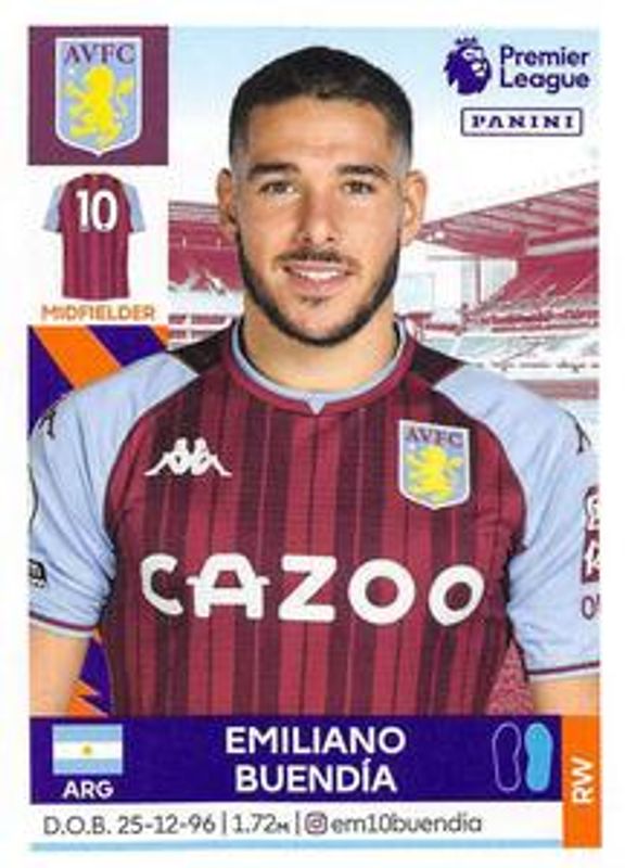 The Emiliano Buendia 2022 Panini Premier League Stickers #65 Base card is 1 of 2 Emiliano Buendia's card variations in the 2022 Panini Premier League Stickers set being tracked by Sports Card Investor, including Base.