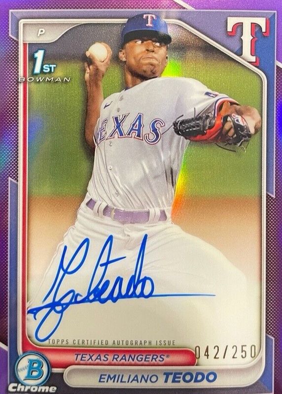 The Emiliano Teodo 2024 Bowman Chrome #CPA-ETE Prospect Auto - Purple Refractor /250 (1st) card in Raw condition has moved up $8.00 (+400%) in the last 30 days and was last sold for $10.00 .