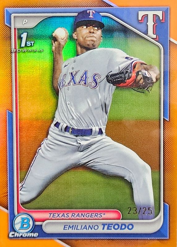 Emiliano Teodo 2024 1st Bowman Chrome ROOKIE RC ORANGE REFRACTOR SSP RANGERS /25