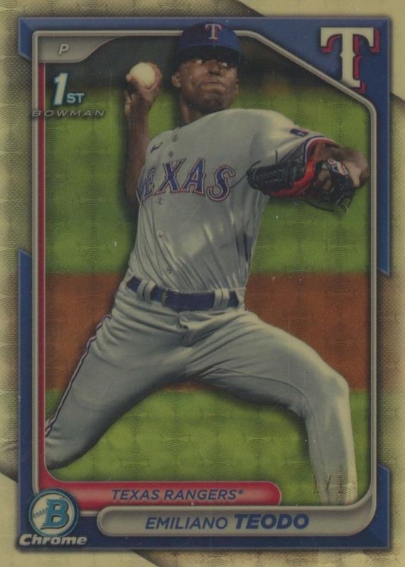 This card is 1 of 51 Emiliano Teodo's card variations in the 2024 Bowman Chrome set being tracked by Sports Card Investor, including Prospects (1st), Prospects - Shimmer Refractor (1st), Prospects - Refractor /499 (1st), Prospects - Speckle Refractor /299 (1st), and Prospects - Purple Refractor /250 (1st).
