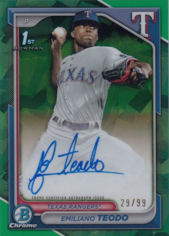 The Emiliano Teodo 2024 Bowman Chrome Sapphire Edition #CSPA-ETE Prospect Auto - Green /99 (1st) card in Raw condition has not changed in price in the last 30 days and was last sold for $11.50 .