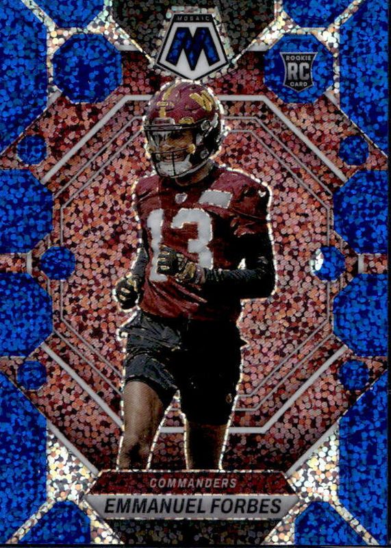 This card is 1 of 40 Emmanuel Forbes' card variations in the 2023 Mosaic set being tracked by Sports Card Investor, including Base, Choice Red & Green, Green, No Huddle, and Pink Camo.