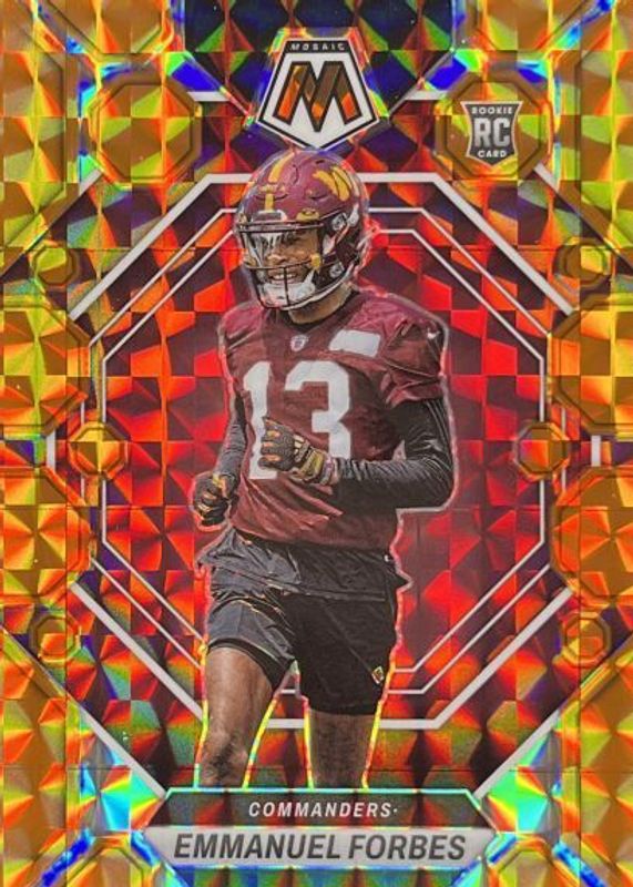 This card is 1 of 40 Emmanuel Forbes' card variations in the 2023 Mosaic set being tracked by Sports Card Investor, including Base, Choice Red & Green, Green, No Huddle, and Pink Camo.
