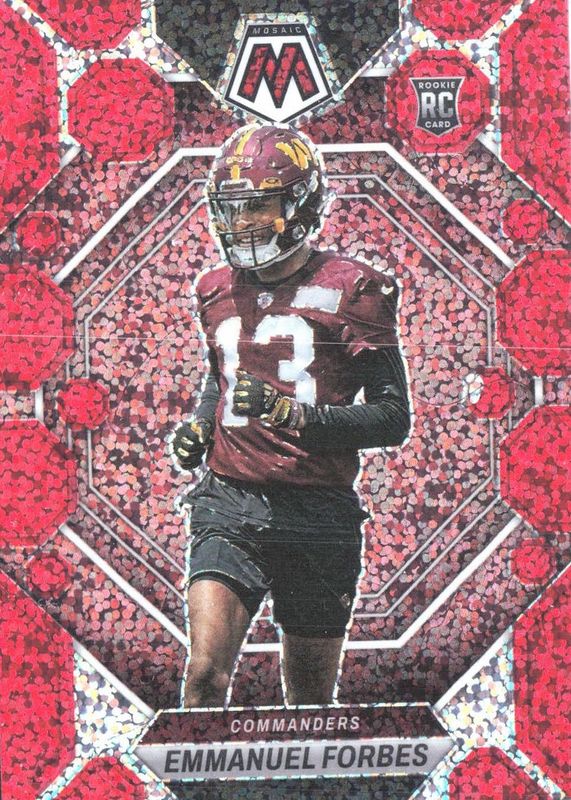This card is 1 of 40 Emmanuel Forbes' card variations in the 2023 Mosaic set being tracked by Sports Card Investor, including Base, Choice Red & Green, Green, No Huddle, and Pink Camo.