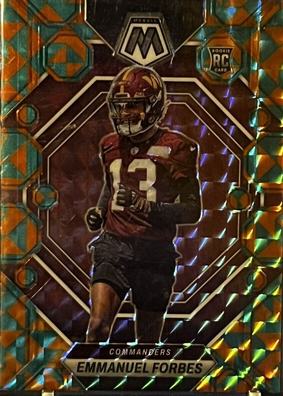 This card is 1 of 40 Emmanuel Forbes' card variations in the 2023 Mosaic set being tracked by Sports Card Investor, including Base, Choice Red & Green, Green, No Huddle, and Pink Camo.