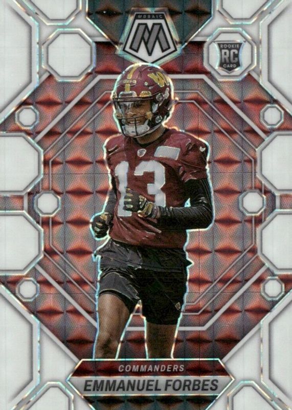 This card is 1 of 40 Emmanuel Forbes' card variations in the 2023 Mosaic set being tracked by Sports Card Investor, including Base, Choice Red & Green, Green, No Huddle, and Pink Camo.