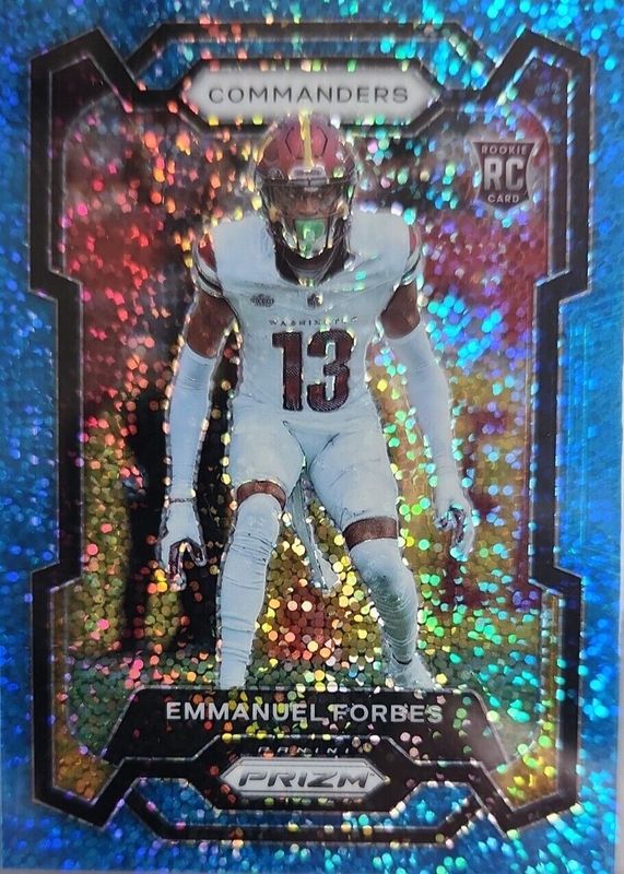 The Emmanuel Forbes 2023 Prizm #399 Blue Sparkle /96 Rookie card in Raw condition has not changed in price in the last 30 days and was last sold for $15.00 .