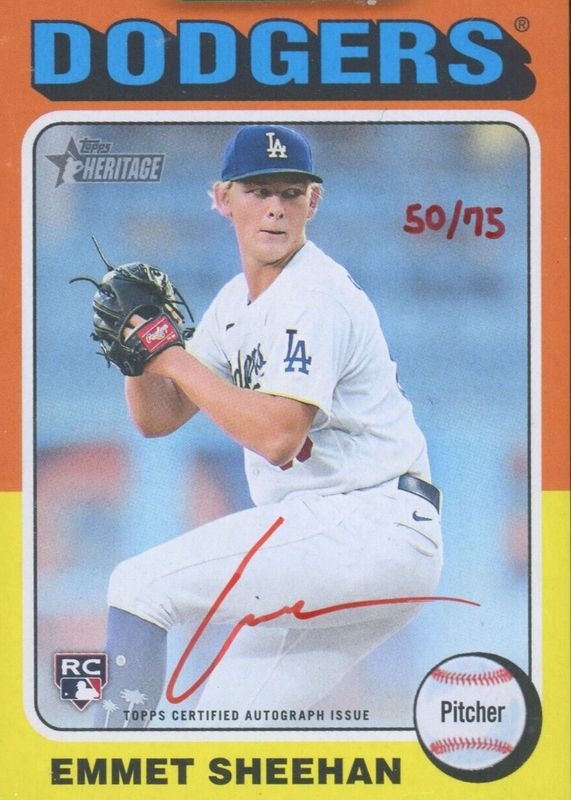 This card is 1 of 2 Emmet Sheehan's card variations in the 2024 Topps Heritage set being tracked by Sports Card Investor, including Real One Autographs.
