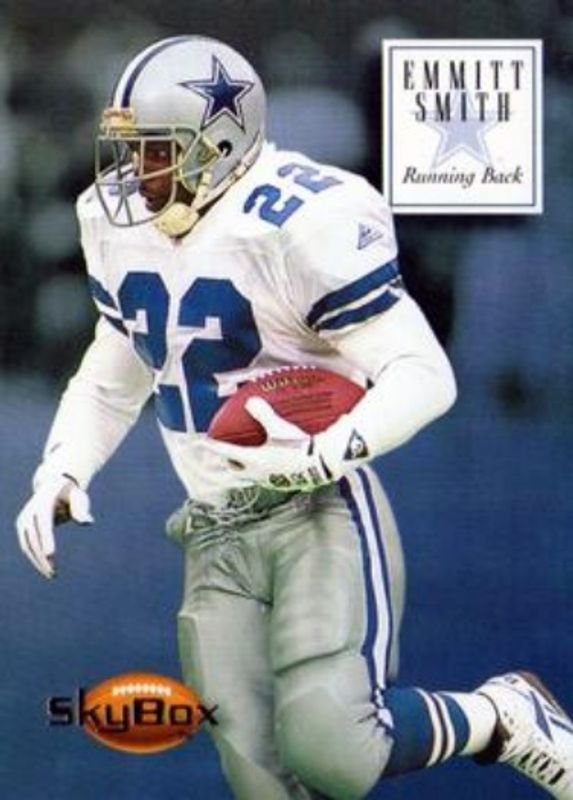 The Emmitt Smith 1994 Skybox Premium #41 Base card is 1 of 3 Emmitt Smith's card variations in the 1994 Skybox Premium set being tracked by Sports Card Investor, including Revolution, and SkyTech Stars.