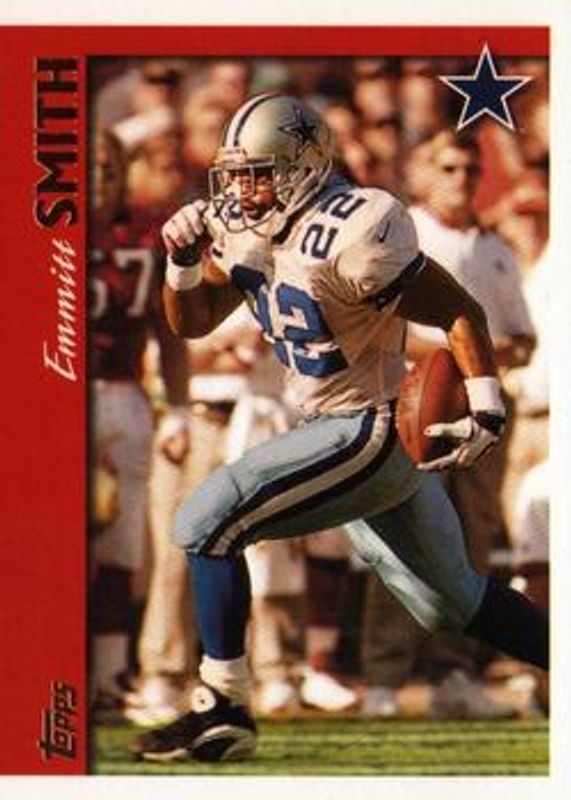 The Emmitt Smith 1997 Topps #220 Base card is 1 of 4 Emmitt Smith's card variations in the 1997 Topps set being tracked by Sports Card Investor, including Minted in Canton, Hall Bound, and High Octane.