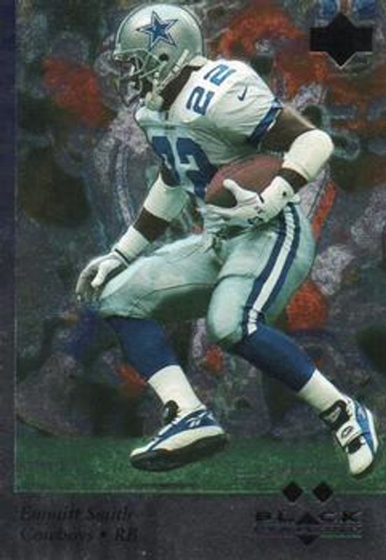 The Emmitt Smith 1997 Upper Deck Black Diamond #107 Base card is 1 of 3 Emmitt Smith's card variations in the 1997 Upper Deck Black Diamond set being tracked by Sports Card Investor, including Gold, and Title Quest /100.