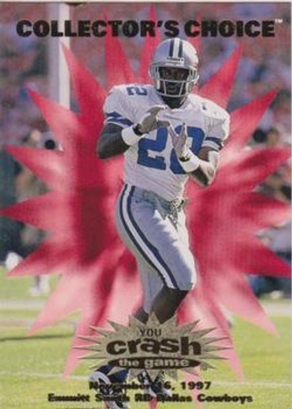 The Emmitt Smith 1997 Upper Deck Collector's Choice #C22b You Crash the Game card is 1 of 11 Emmitt Smith's card variations in the 1997 Upper Deck Collector's Choice set being tracked by Sports Card Investor, including #162 Base, #59 Base, #ST11 Mini Standee, #2 Names of the Game 3x5, and #2 Names of the Game 5x7.