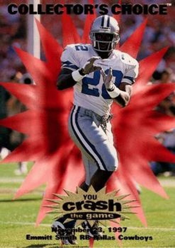 The Emmitt Smith 1997 Upper Deck Collector's Choice #C22c You Crash the Game card is 1 of 11 Emmitt Smith's card variations in the 1997 Upper Deck Collector's Choice set being tracked by Sports Card Investor, including #162 Base, #59 Base, #ST11 Mini Standee, #2 Names of the Game 3x5, and #2 Names of the Game 5x7.