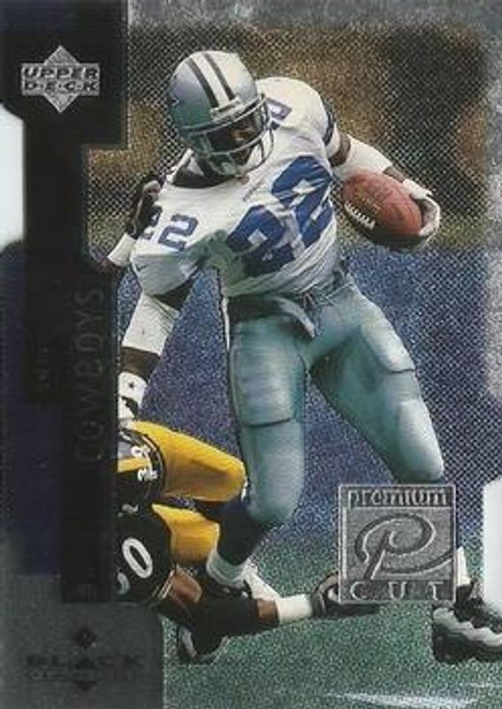 The Emmitt Smith 1998 Upper Deck Black Diamond #PC22 Premium Cut card is 1 of 9 Emmitt Smith's card variations in the 1998 Upper Deck Black Diamond set being tracked by Sports Card Investor, including Base, Double, Quadruple, Triple, and Premium Cut - Double.