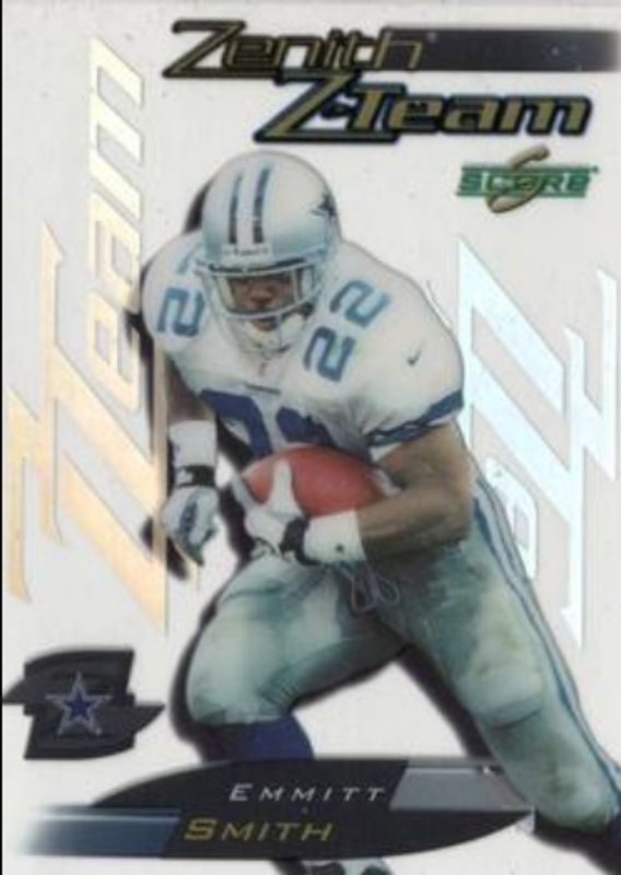 The Emmitt Smith 1999 Score Supplemental #ZZT-5 Zenith Z Team /100 card is 1 of 5 Emmitt Smith's card variations in the 1999 Score Supplemental set being tracked by Sports Card Investor, including Base, 2000 Quantum Leaf Previews, Behind the Numbers /1000, and Behind the Numbers - Gold /13.