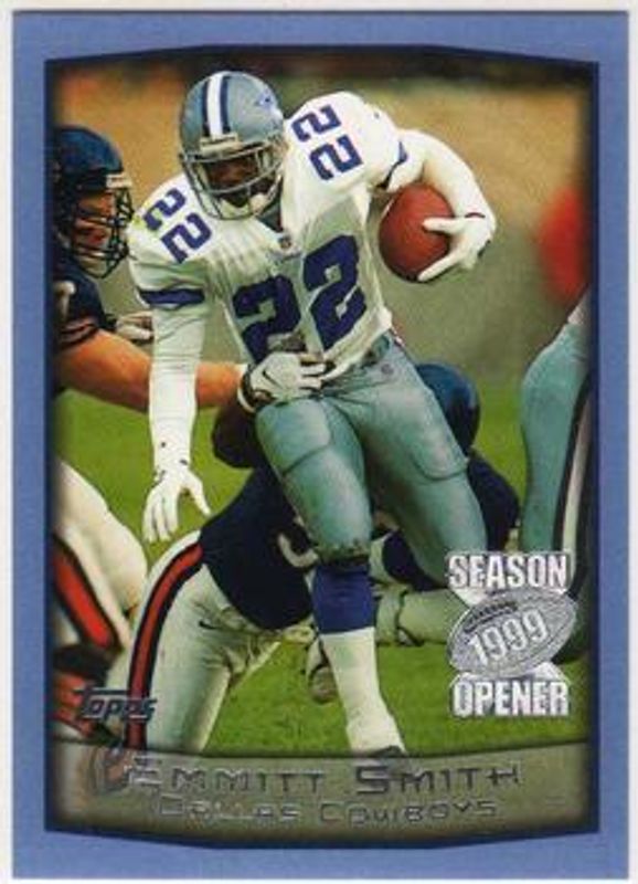 The Emmitt Smith 1999 Topps Season Opener #2 Base card is 1 of 2 Emmitt Smith's card variations in the 1999 Topps Season Opener set being tracked by Sports Card Investor, including Base.