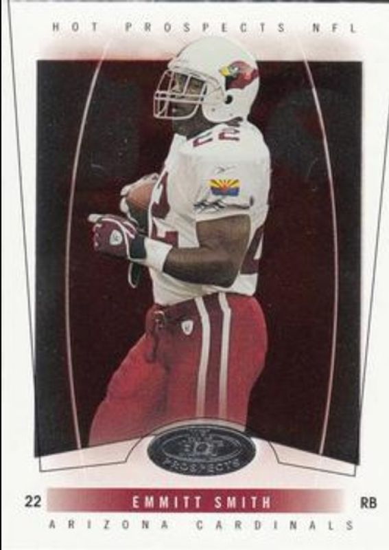 The Emmitt Smith 2004 Fleer Hot Prospects #56 Base /350 card is 1 of 13 Emmitt Smith's card variations in the 2004 Fleer Hot Prospects set being tracked by Sports Card Investor, including Red Hot /50, White Hot /1, Draft Rewind, Hot Materials /500, and Draft Rewind Jersey /154.