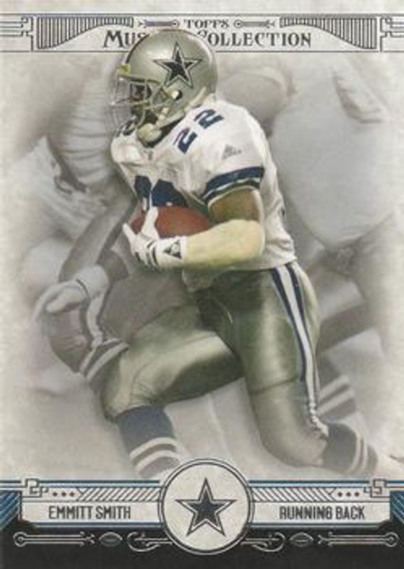 The Emmitt Smith 2014 Topps Museum Collection #4 Base card is 1 of 9 Emmitt Smith's card variations in the 2014 Topps Museum Collection set being tracked by Sports Card Investor, including Copper, Sapphire /99, Ruby /50, Emerald /1, and Canvas Collection.
