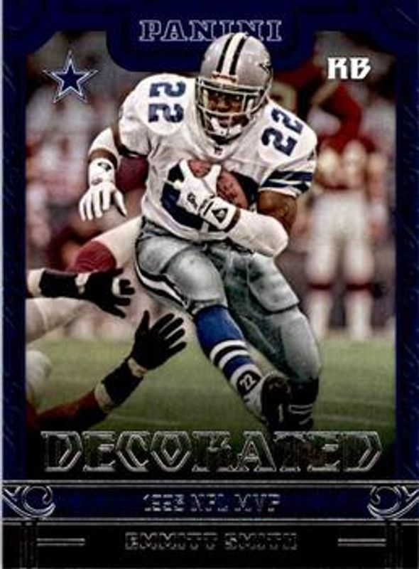 The Emmitt Smith 2016 Panini #15 Decorated card is 1 of 13 Emmitt Smith's card variations in the 2016 Panini set being tracked by Sports Card Investor, including Accolades, Knights of the Round Die Cuts, Legends of the Shield, Accolades - Red /25, and Decorated - Red /25.