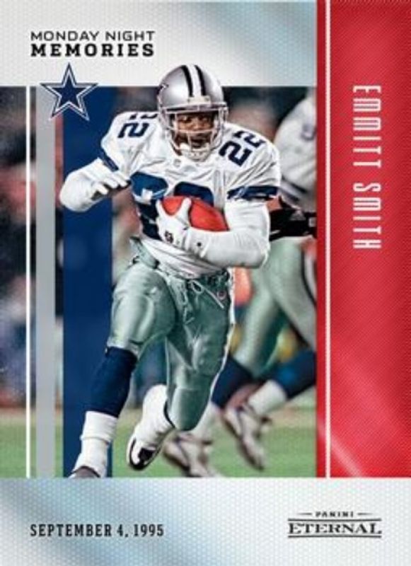 The Emmitt Smith 2017 Eternal #PE-MM10 Monday Night Memories card is 1 of 3 Emmitt Smith's card variations in the 2017 Eternal set being tracked by Sports Card Investor, including Monday Night Memories - Green /10, and Monday Night Memories - Black /1.