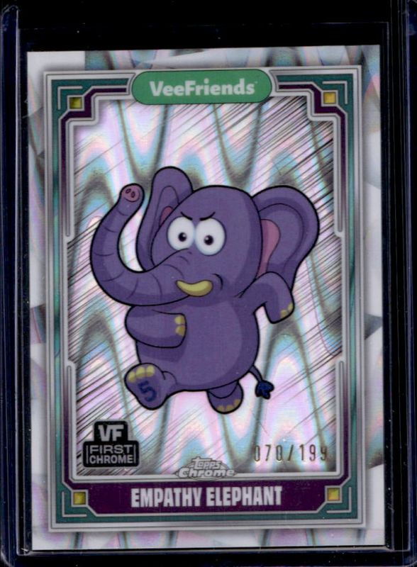 The Empathy Elephant 2025 Topps Chrome VeeFriends #9 RayWave Refractor /199 card is 1 of 30 Empathy Elephant's card variations in the 2025 Topps Chrome VeeFriends set being tracked by Sports Card Investor, including Base, Refractor, Yellow Refractor, Shimmer Refractor /250, and Wave Refractor /150.