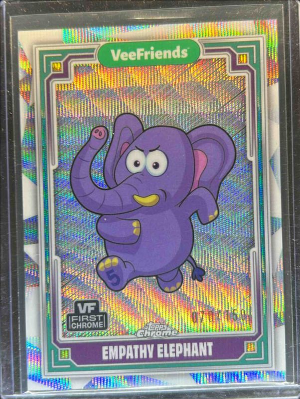 The Empathy Elephant 2025 Topps Chrome VeeFriends #9 Wave Refractor /150 card is 1 of 30 Empathy Elephant's card variations in the 2025 Topps Chrome VeeFriends set being tracked by Sports Card Investor, including Base, Refractor, Yellow Refractor, Shimmer Refractor /250, and RayWave Refractor /199.