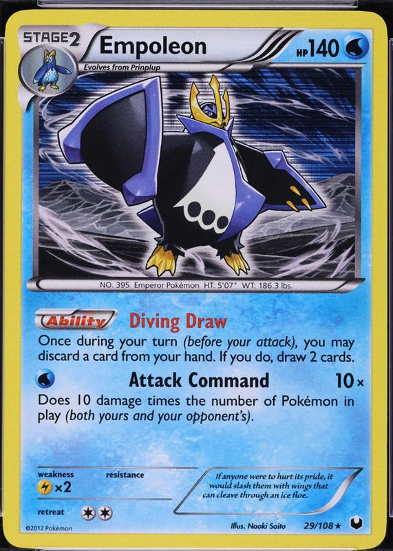 The Empoleon 2012 Black & White: Dark Explorers #029/108 Holo card in Raw TCG (Lightly Played) condition has moved up $1.55 (+77.9%) in the last 30 days and was last sold for $3.54 .