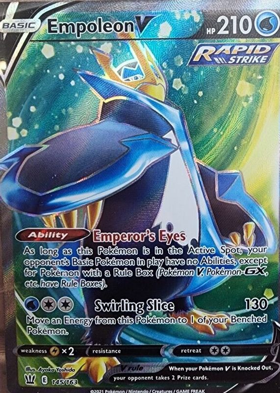 The Empoleon V 2021 Sword & Shield: Battle Styles #145/163 Holo (Full Art) card in Raw TCG (Near Mint) condition has moved up $0.00 (+0.1%) in the last 30 days and was last sold for $6.99 .
