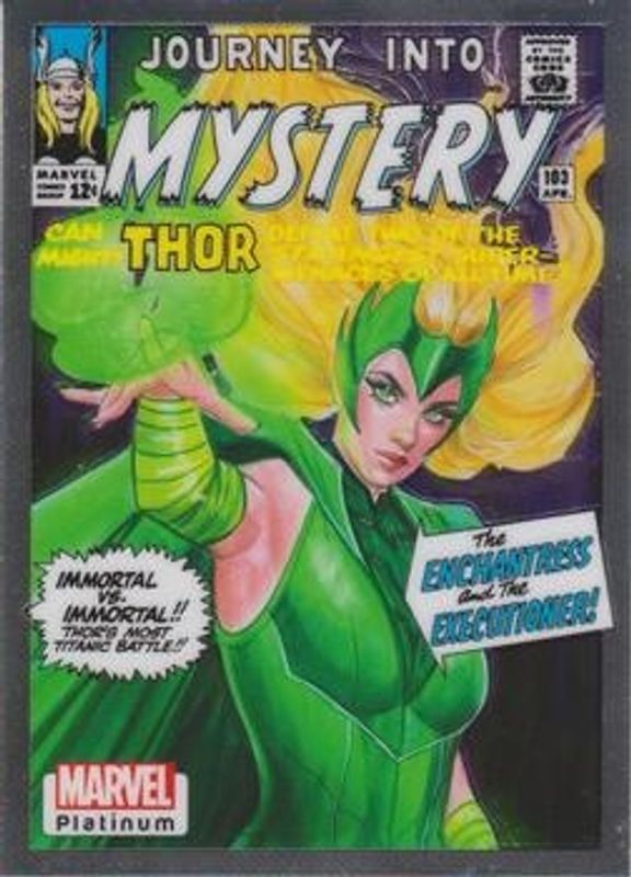 The Enchantress 2023 Upper Deck Marvel Platinum #WI32 Cover Variant card is 1 of 42 Enchantress' card variations in the 2023 Upper Deck Marvel Platinum set being tracked by Sports Card Investor, including Base, Black Rainbow, Blue Rainbow, Blue Surge, and Purple Rainbow.