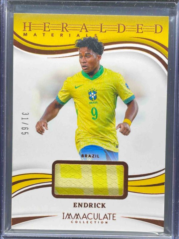 The Endrick 2024 Immaculate Collection #10 Heralded Materials /99 card is 1 of 52 Endrick's card variations in the 2024 Immaculate Collection set being tracked by Sports Card Investor, including Base /70, Silver /40, Sapphire /25, Ruby /19, and Gold /10.