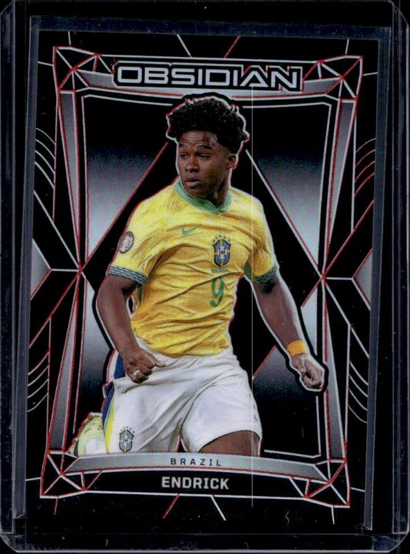 The Endrick 2024 Obsidian #51 Electric Etch Red /12 card is 1 of 57 Endrick's card variations in the 2024 Obsidian set being tracked by Sports Card Investor, including Base /145, Electric Etch Red Pulsar /44, Electric Etch Orange /40, Electric Etch Purple Flood /30, and Electric Etch Imperial Jade /26.