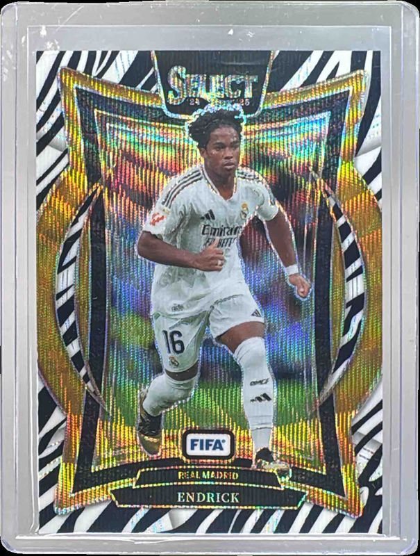 The Endrick 2024 Select FIFA #2 Terrace Zebra card is 1 of 107 Endrick's card variations in the 2024 Select FIFA set being tracked by Sports Card Investor, including Artistic Impressions, Field Level, Field Level Blue, Field Level Blue Lazer, and Field Level Flash.