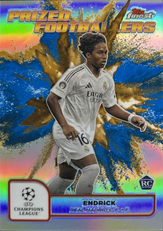 The Endrick 2024 Topps Finest UEFA Club Competitions #PFF-16 Prized Footballers Fusion - Black Gold Refractor /1 card is 1 of 98 Endrick's card variations in the 2024 Topps Finest UEFA Club Competitions set being tracked by Sports Card Investor, including Base, Refractor, Purple Refractor /299, Sky Blue Refractor /275, and Pink RayWave Refractor /250.