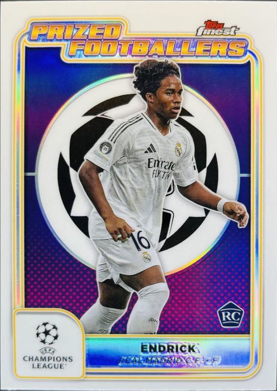 The Endrick 2024 Topps Finest UEFA Club Competitions #PF-16 Prized Footballers card is 1 of 98 Endrick's card variations in the 2024 Topps Finest UEFA Club Competitions set being tracked by Sports Card Investor, including Base, Refractor, Purple Refractor /299, Sky Blue Refractor /275, and Pink RayWave Refractor /250.