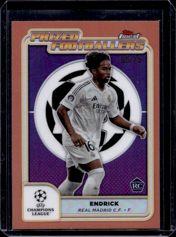 The Endrick 2024 Topps Finest UEFA Club Competitions #PF-16 Prized Footballers - Rose Gold Refractor /75 card is 1 of 98 Endrick's card variations in the 2024 Topps Finest UEFA Club Competitions set being tracked by Sports Card Investor, including Base, Refractor, Purple Refractor /299, Sky Blue Refractor /275, and Pink RayWave Refractor /250.
