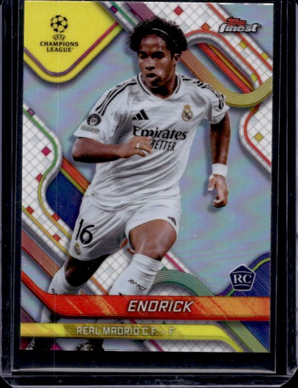 The Endrick 2024 Topps Finest UEFA Club Competitions #100 Refractor card is 1 of 98 Endrick's card variations in the 2024 Topps Finest UEFA Club Competitions set being tracked by Sports Card Investor, including Base, Purple Refractor /299, Sky Blue Refractor /275, Pink RayWave Refractor /250, and Purple Lava Refractor /199.
