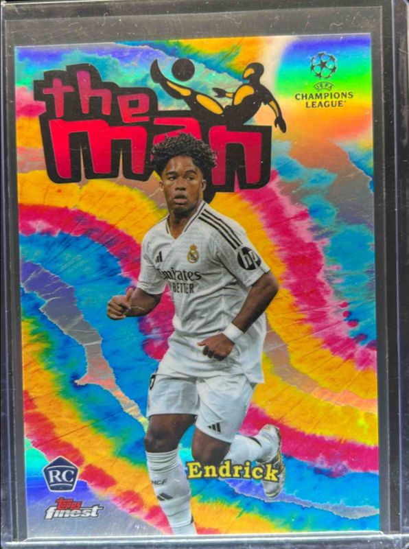 The Endrick 2024 Topps Finest UEFA Club Competitions #TM-19 The Man card is 1 of 98 Endrick's card variations in the 2024 Topps Finest UEFA Club Competitions set being tracked by Sports Card Investor, including Base, Refractor, Purple Refractor /299, Sky Blue Refractor /275, and Pink RayWave Refractor /250.