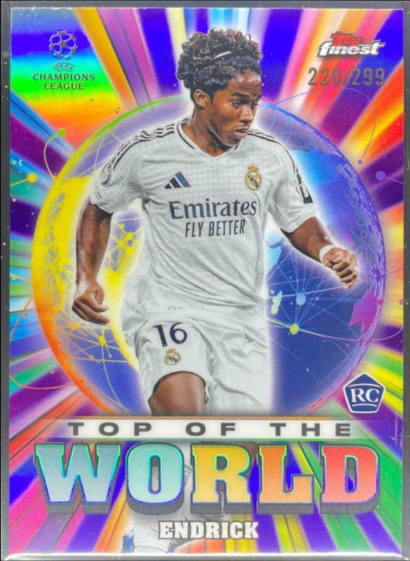 The Endrick 2024 Topps Finest UEFA Club Competitions #TW-30 Top of the World - Purple Refractor /299 card is 1 of 98 Endrick's card variations in the 2024 Topps Finest UEFA Club Competitions set being tracked by Sports Card Investor, including Base, Refractor, Purple Refractor /299, Sky Blue Refractor /275, and Pink RayWave Refractor /250.