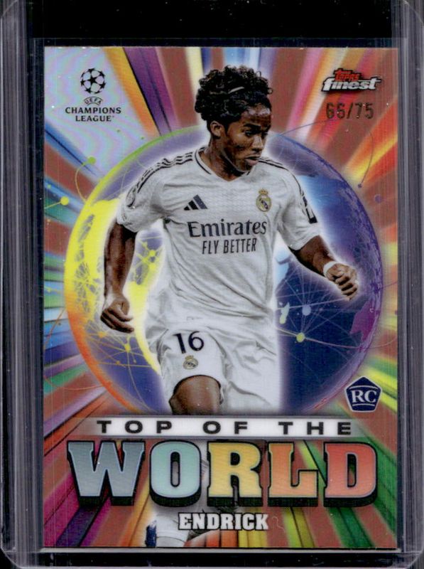 The Endrick 2024 Topps Finest UEFA Club Competitions #TW-30 Top of the World - Rose Gold Refractor /75 card is 1 of 98 Endrick's card variations in the 2024 Topps Finest UEFA Club Competitions set being tracked by Sports Card Investor, including Base, Refractor, Purple Refractor /299, Sky Blue Refractor /275, and Pink RayWave Refractor /250.