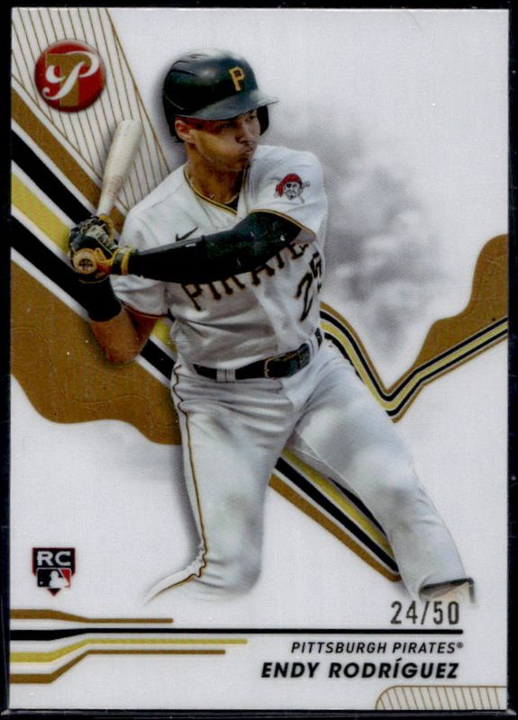 The Endy Rodriguez 2024 Topps Pristine #149 Gold Refractor /50 Rookie card is 1 of 26 Endy Rodriguez's card variations in the 2024 Topps Pristine set being tracked by Sports Card Investor, including Base, Pristine Refractor, Refractor, Green Refractor /150, and Pristine Purple Refractor /99.