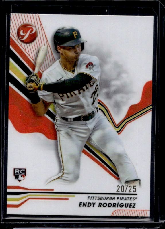 The Endy Rodriguez 2024 Topps Pristine #149 Orange Refractor /25 Rookie card is 1 of 26 Endy Rodriguez's card variations in the 2024 Topps Pristine set being tracked by Sports Card Investor, including Base, Pristine Refractor, Refractor, Green Refractor /150, and Pristine Purple Refractor /99.