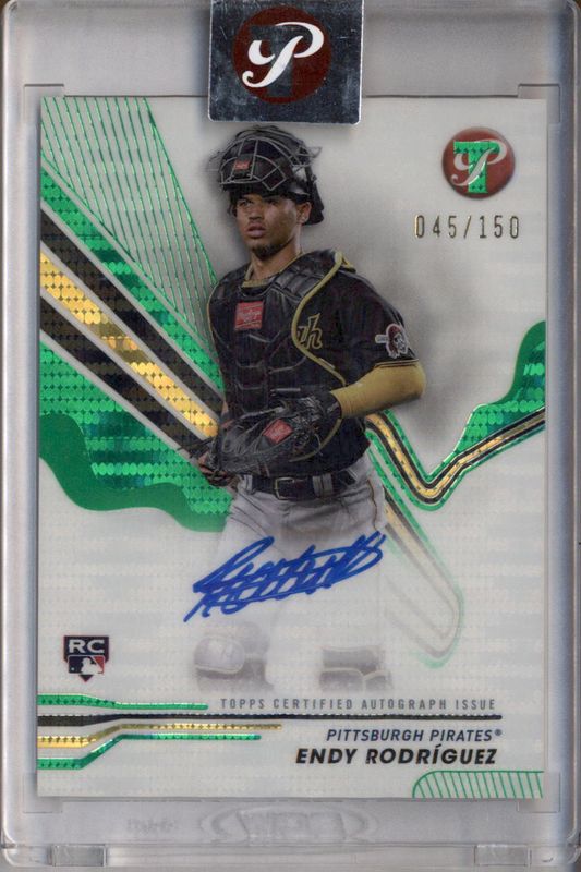 The Endy Rodriguez 2024 Topps Pristine #PA-ER Pristine Autographs - Green Pristine Refractor /150 Rookie card is 1 of 26 Endy Rodriguez's card variations in the 2024 Topps Pristine set being tracked by Sports Card Investor, including Base, Pristine Refractor, Refractor, Green Refractor /150, and Pristine Purple Refractor /99.