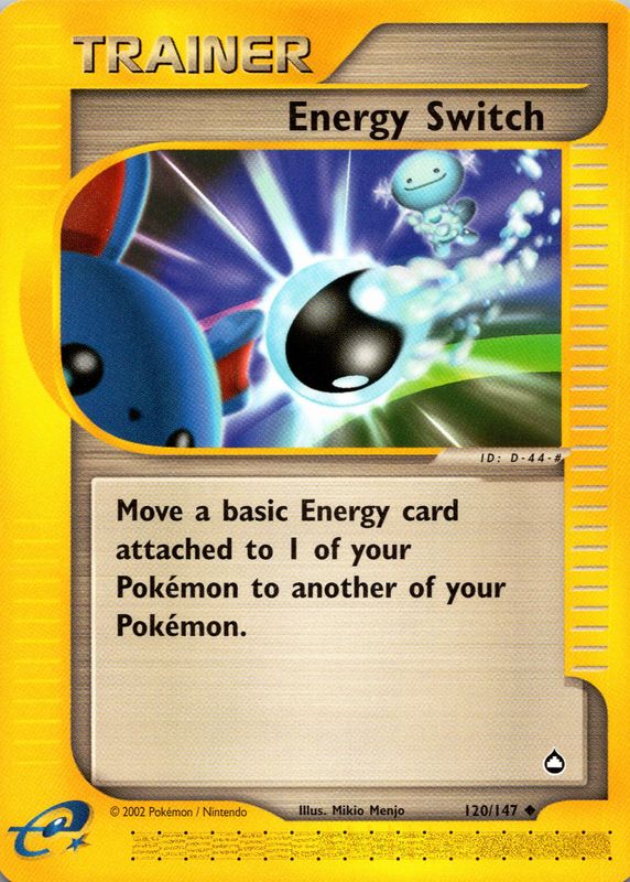 The Energy Switch 2003 Aquapolis #120/147 Base card in Raw TCG (Near Mint) condition has not changed in price in the last 30 days and was last sold for $15.00 .