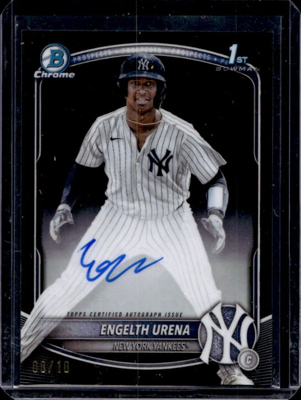 The Engelth Urena 2025 Bowman Sapphire Edition #CPS-EU Chrome Prospect Autographs - Black Refractor /10 card is 1 of 16 Engelth Urena's card variations in the 2025 Bowman Sapphire Edition set being tracked by Sports Card Investor, including Chrome Prospects, Chrome Prospect Autographs /199, Chrome Prospect Autographs - Green Refractor /99, Chrome Prospects - Green Refractor /99, and Chrome Prospects - Yellow Refractor /75.