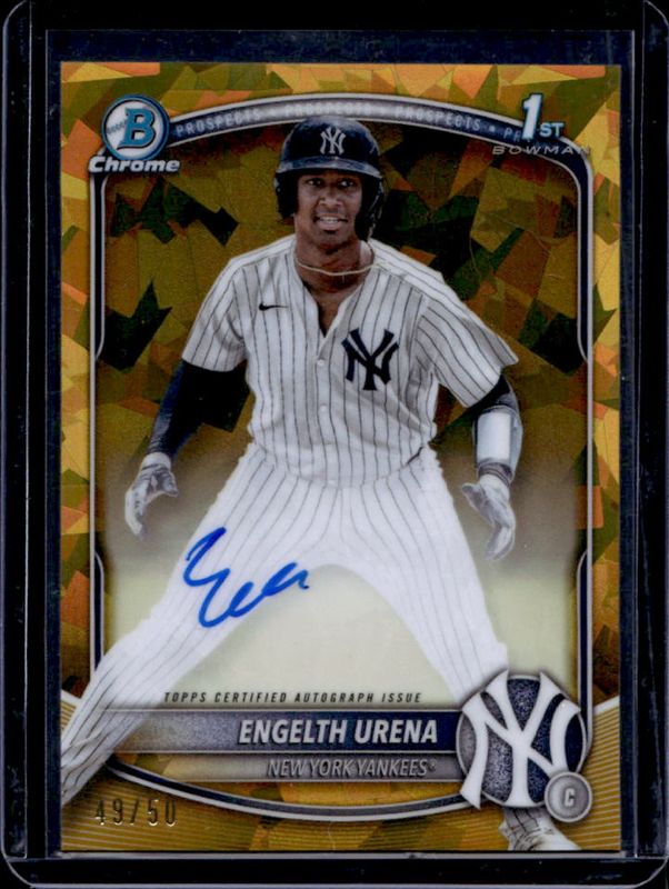 The Engelth Urena 2025 Bowman Sapphire Edition #CPS-EU Chrome Prospect Autographs - Gold Refractor /50 card is 1 of 16 Engelth Urena's card variations in the 2025 Bowman Sapphire Edition set being tracked by Sports Card Investor, including Chrome Prospects, Chrome Prospect Autographs /199, Chrome Prospect Autographs - Green Refractor /99, Chrome Prospects - Green Refractor /99, and Chrome Prospects - Yellow Refractor /75.