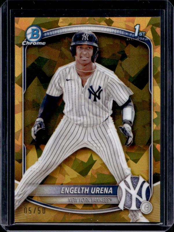 The Engelth Urena 2025 Bowman Sapphire Edition #BCP-16 Chrome Prospects - Gold Refractor /50 card is 1 of 16 Engelth Urena's card variations in the 2025 Bowman Sapphire Edition set being tracked by Sports Card Investor, including Chrome Prospects, Chrome Prospect Autographs /199, Chrome Prospect Autographs - Green Refractor /99, Chrome Prospects - Green Refractor /99, and Chrome Prospects - Yellow Refractor /75.