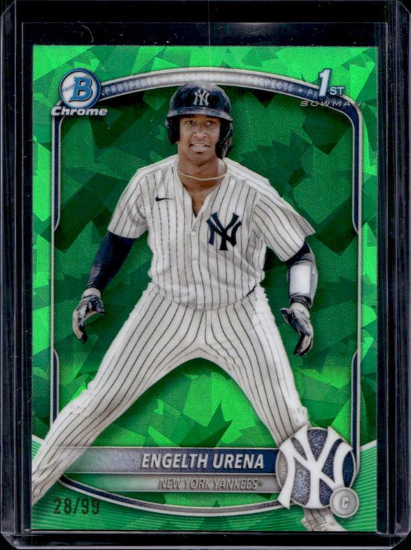 The Engelth Urena 2025 Bowman Sapphire Edition #BCP-16 Chrome Prospects - Green Refractor /99 card is 1 of 16 Engelth Urena's card variations in the 2025 Bowman Sapphire Edition set being tracked by Sports Card Investor, including Chrome Prospects, Chrome Prospect Autographs /199, Chrome Prospect Autographs - Green Refractor /99, Chrome Prospects - Yellow Refractor /75, and Chrome Prospect Autographs - Gold Refractor /50.
