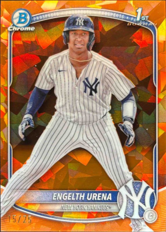 The Engelth Urena 2025 Bowman Sapphire Edition #BCP-16 Chrome Prospects - Orange Refractor /25 card is 1 of 16 Engelth Urena's card variations in the 2025 Bowman Sapphire Edition set being tracked by Sports Card Investor, including Chrome Prospects, Chrome Prospect Autographs /199, Chrome Prospect Autographs - Green Refractor /99, Chrome Prospects - Green Refractor /99, and Chrome Prospects - Yellow Refractor /75.